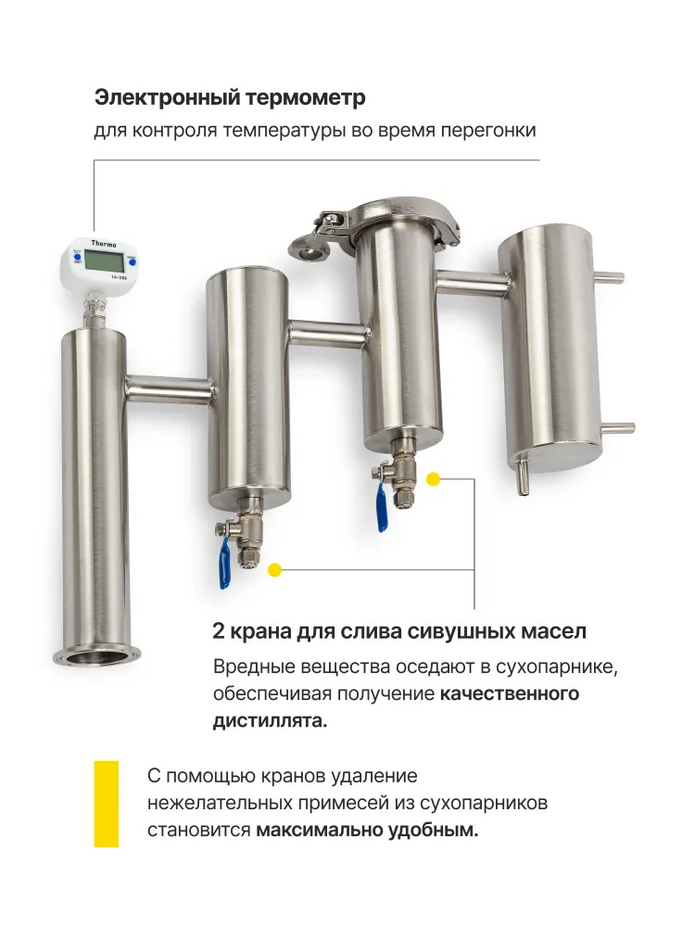 То, что на фото — это только «основа», разумеется. Такой аппарат в дефолтной комплектации подойдет только для перегонки браги в спирт-сырец (первая перегонка). Для второй перегонки и получения из спирта-сырца уже очищенного спирта высокого градуса (до 95%) — понадобится докупить еще царгу на 50 см и дефлегматор, насколько я понимаю. Это еще примерно 2 000 ₽ вложений.